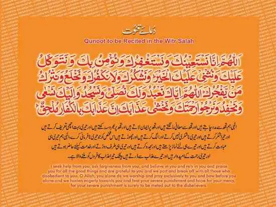 Allah humma inna nast’eenuka wa nastaghfiruka wa nu’minu bika wa natawak-kalu ‘alayka wa nuthne ‘alayk-al khayr. Wa nashkuruka wa laaa nakfuruka wa nakhla’u wa natruku man-y yafjuruka. Allah humma iyyaka na’budu wa laka nusal-lee wa nasjudu wa ilayka nas’a wa nahfidu wa narju rahmataka wa nakhsha ‘azabaka inna ‘azabaka bil kuf-fari mulhiq.
