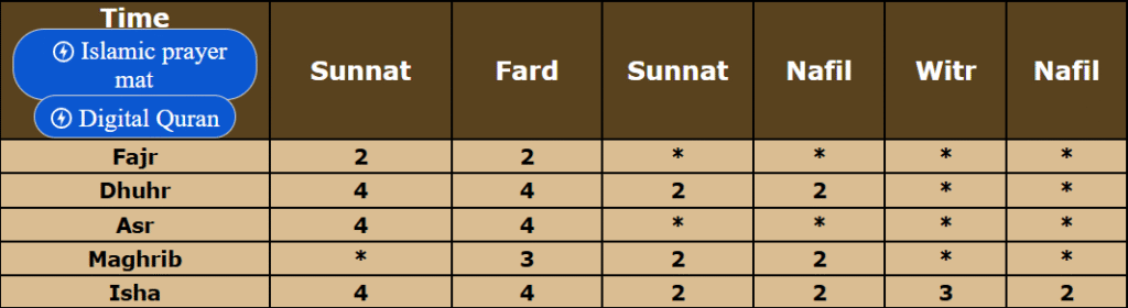Four Rakats Farz, Two Rakats Sunnat, Two Rakats Nafil, Three Rakats Wajib Witr, Two Rakats Nafil